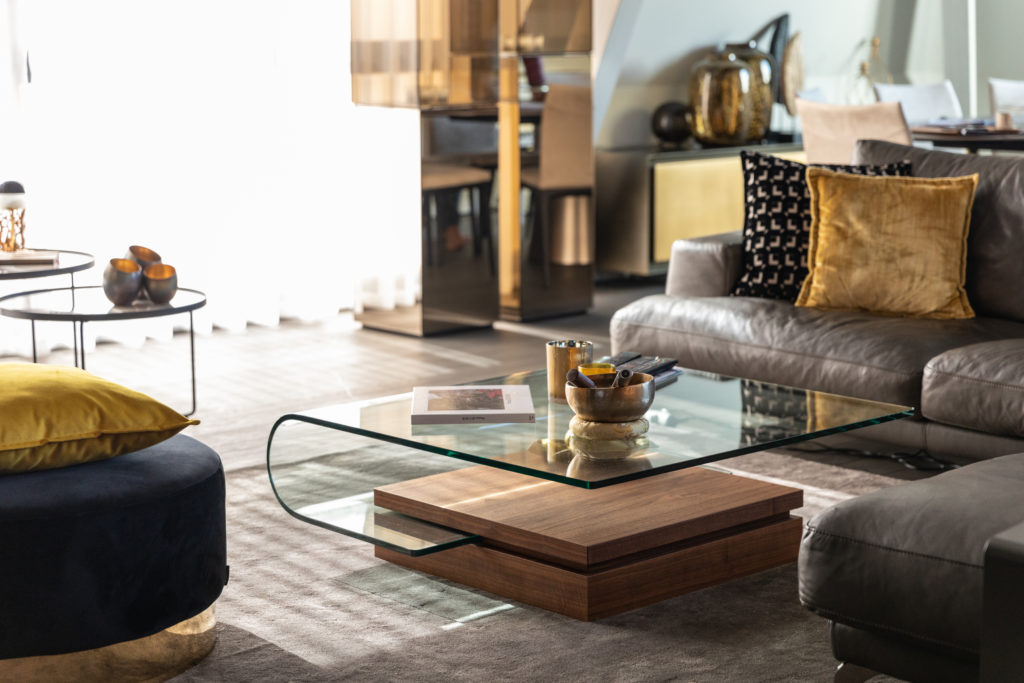 La salle à manger est superbe avec sa table Yoda Keramik et son pied si particulier. Elle est sublimée par ce lustre Appollo, aux sphères de verre qui dansent au dessus de la table de la maison Cattelan Italia.