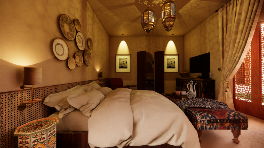 Ce projet de décoration s’inspire de l’élégance intemporelle et du raffinement de l’architecture marocaine traditionnelle, tout en y ajoutant une touche de modernité et de confort. Nous avons souhaité créer un espace où chaque élément évoque l’authenticité du Maroc tout en offrant un cadre luxueux et reposant pour les hôtes.