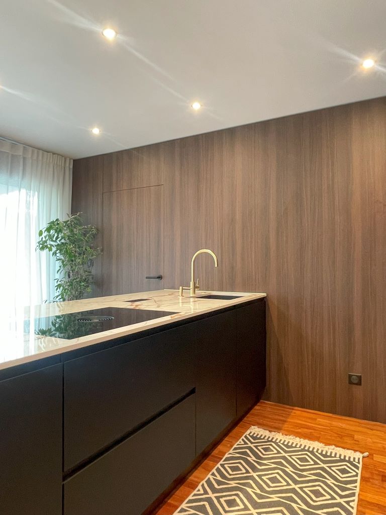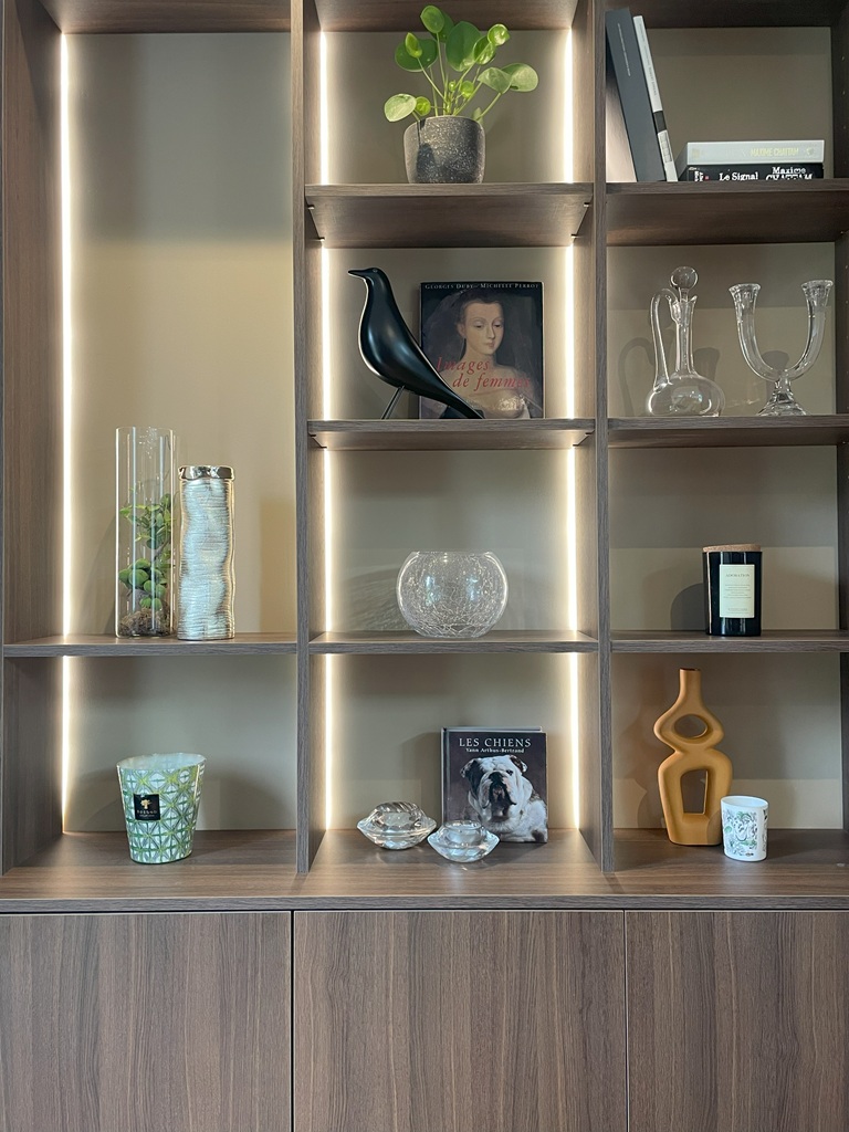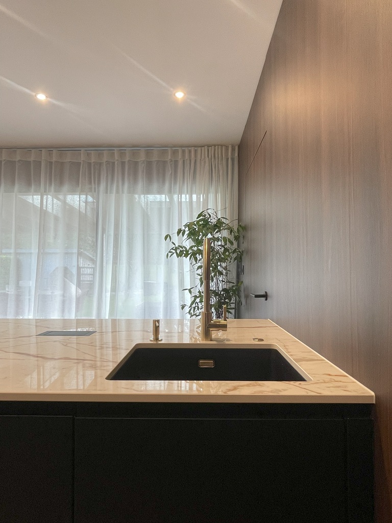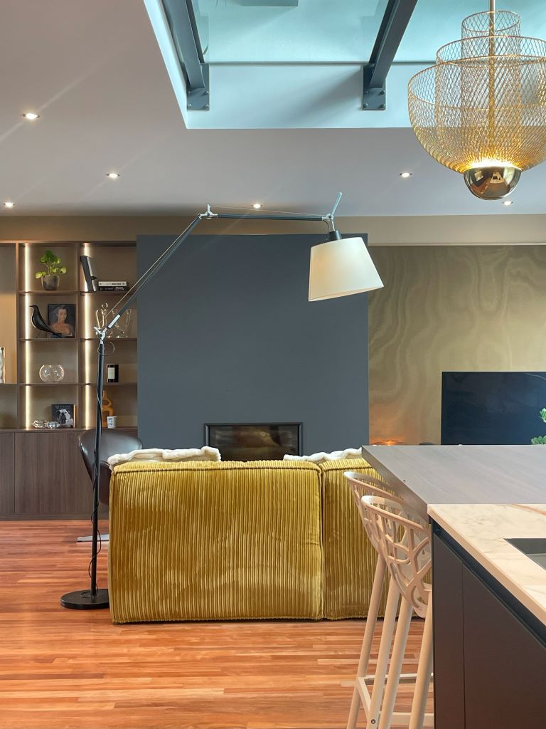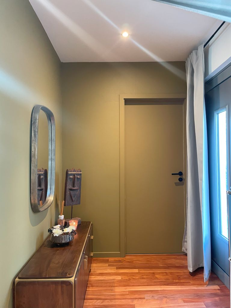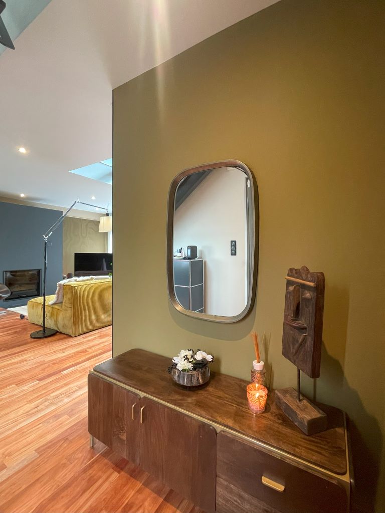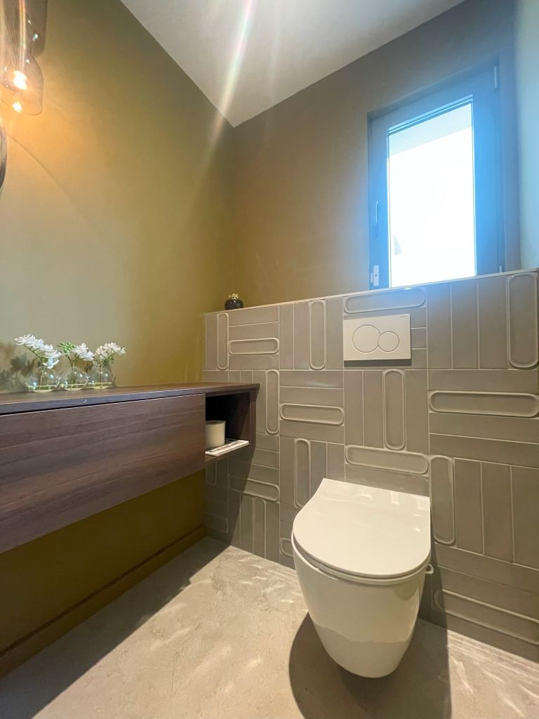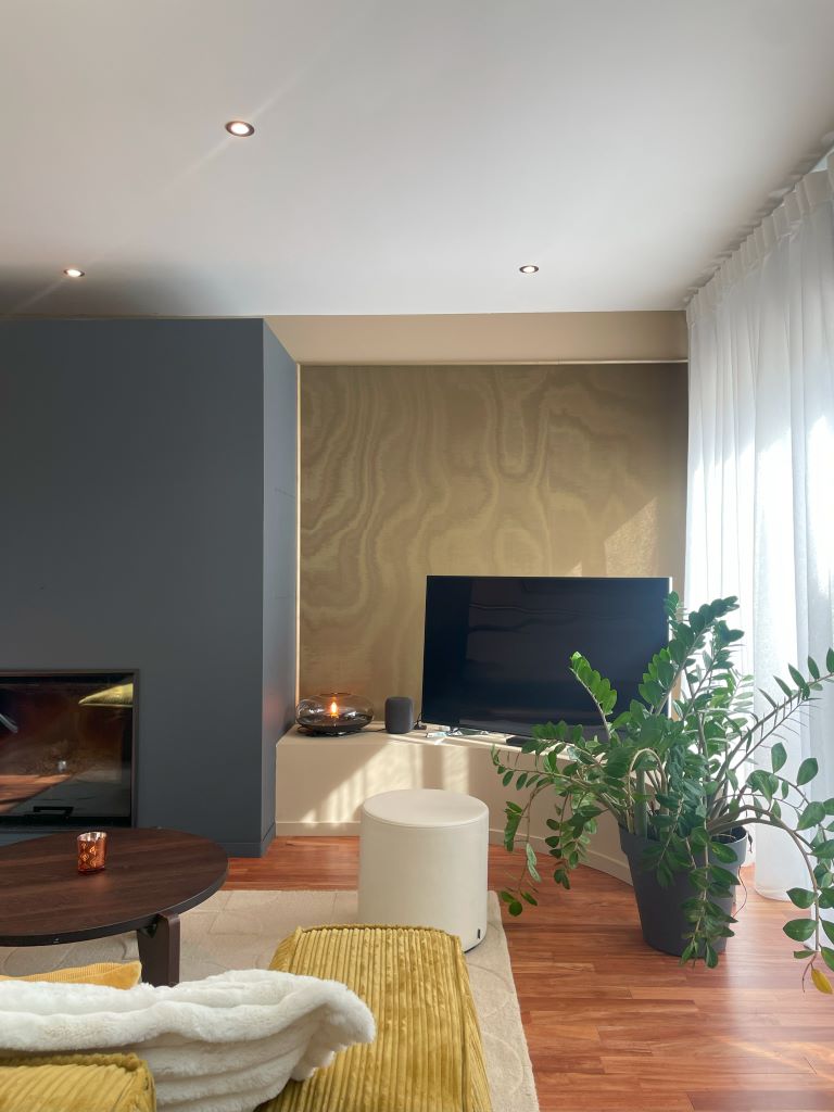 Dans cette belle maison contemporaine construite il y a plus de 10 ans avec un architecte, plusieurs choses ne convenaient plus à notre cliente. La décoration générale, mais surtout le manque d’aspect pratique de l’entrée, de la cheminée et de la cuisine. Le premier souci se situant dès l’entrée, puisque celle ci n’avait pas été démarquée, aucun espace de rangement, pas de meuble dépose clé, une vue directe sur l’espace de vie, mais aussi du froid qui pénétrait de suite à l’ouverture de la porte. Nous avons donc proposé de cloisonner l’espace, en ajoutant un mur en continuité du wc, ce qui a permis de mettre la porte d’accès au toilettes à distance de la vue, depuis l’espace de vie, ce qui était aussi un problème ! Cette cloison a permis d’un côté d’appuyer un petit bahut pour déposer les clés et autres accessoires mais aussi d’agrandir la cuisine de l’autre côté. Le mur a été peint dans le coloris « soupe d’ortie » de la magnifique gamme de peinture de Bilboquet déco. Le parquet d’origine a été conservé, nous l’avons simplement ravivé avec un ponçage léger et l’application d’une huile. Dans le fond de la pièce, on peut découvrir en « slidant », l’ancienne cheminée dont l’habillage prenait presque tout le mur. Nous avons réduit le volume d’encastrement du foyer et crée un meuble sur mesure en plâtre sur la droite, afin d’y poser la télévision. Puis sur la gauche, nous avons imaginé une magnifique bibliothèque permettant à la cliente de ranger des choses en partie basse et mettre en valeur de beaux objets et livres en partie haute. La bibliothèque réalisée par la menuiserie Lang a Habsheim, dans une finition chêne foncé, est rythmée par de nombreuses niches à différentes hauteurs, les verticales sont soulignées par des bandeaux led afin d’apporter un éclairage doux et diffut, mais aussi une sensation de flottement des appuis sur le mur. L’arrière est peint dans un coloris beige Albâtre qui contraste avec la cheminée relookée dans une tonalité plus sombre. Le coin salon est délimité par le canapé qui tourne le dos à la cuisine ouverte sur l’espace de vie. Le canapé modulable en velour côtelé trouvé chez Ligne Design à Lutterbach, fait face à la cheminée et à la télévision dont l’arrière plan est décoré du papier peint Moire de chez Elitis qui donne des reflets magiques et des tonalités changeantes selon le point de vue dans la pièce. Le fil conducteur de ces espaces sont les larges baies vitrées habillées de voilages réalisés sur mesure, du salon jusqu’à la cuisine. La cuisine n’a plus rien à voir avec ce qu’elle était, de par son style mais surtout par son implantation. Un vaste ilôt vient s’appuyer sur le mur du fond que nous avons habillé de panneaux de bois afin de fondre la porte technique menant au cellier. L’ilôt fait de façades noires mates est habillé d’une céramique marbre de chez X stone , il se poursuit par un plateau en bois assorti au mur et à la bibliothèque offrant un espace de repas pour quatres personnes. Pour un style minimaliste nous avons opté pour une plaque aspirante et un évier sous plan, le mitigeur très déco en finition laiton de chez Bradano apporte une touche chic et élégante à cette cuisine avec la suspension de Moooi au dessus du snack. Une large niche en marbre dans le linéaire de colonnes noires mates permet de poser les appareils électroménager. Le salon est rythmé par ce canapé design en velour de Franco Ferri, mais aussi le célèbre fauteuil Swan en cuir de Jacobsen. Un grand lampadaire sur pied Artemide vient éclairer cet espace de détente. Pour finir, le toilette s’est refait une beauté afin de s’assortir à l’ensemble, nous avons non seulement gagné de l’espace en abattant la cloison de gauche pour la pousser un peu vers la cuisine, mais nous avons relooké complètement le lieu. Un meuble sur mesure en bois foncé file sur le long du mur de gauche permettant d’y mettre une vasque à poser, quelques serviettes et bougies. Puis le bâti support a été rallongé et habillé du magnifique carrelage Aquarelle Olive de chez Wow design. Pour finir nous avons peint l’ensemble des murs dans le même coloris que l’entrée qui match parfaitement avec le carreau. Alors maintenant, on s’occupe de chez vous ?