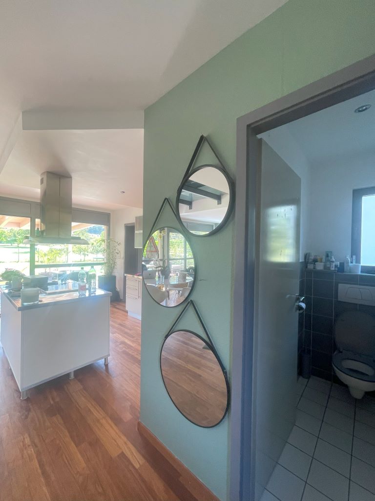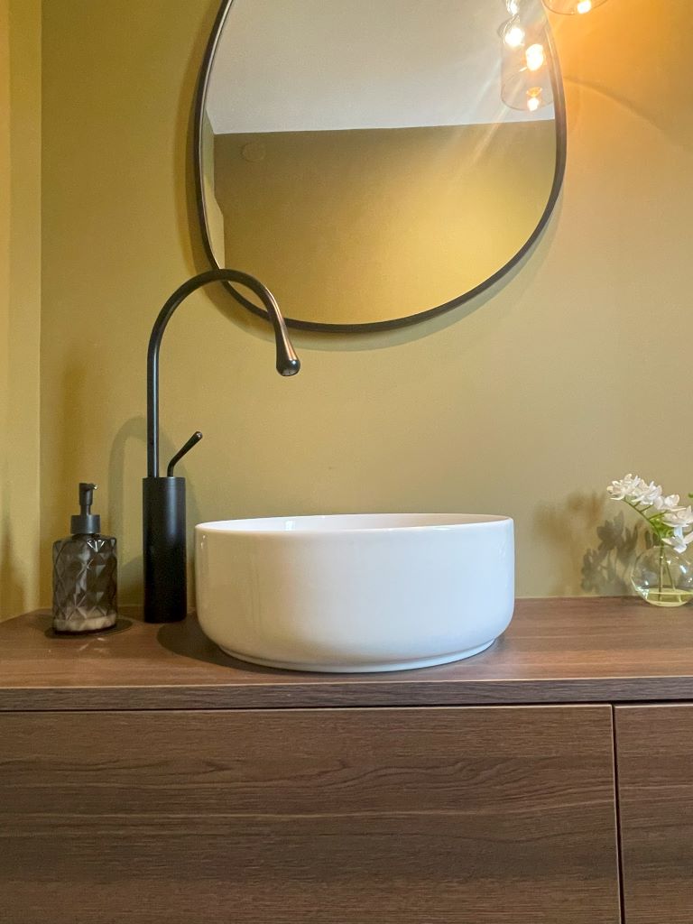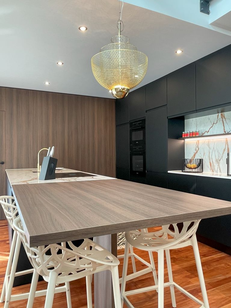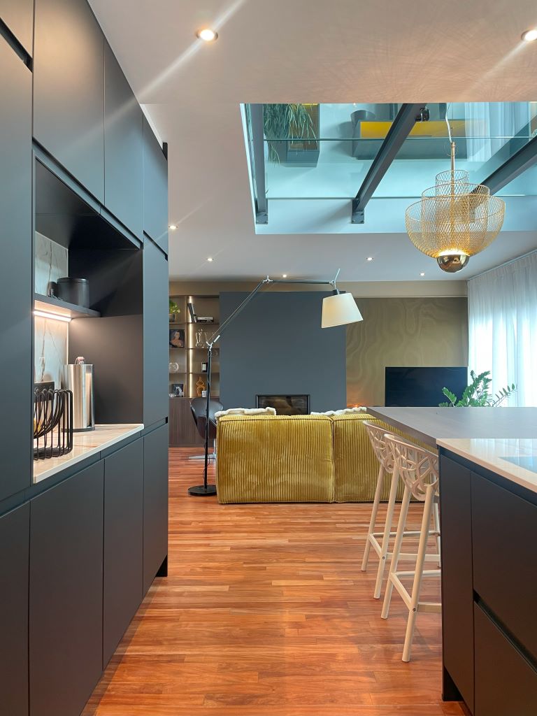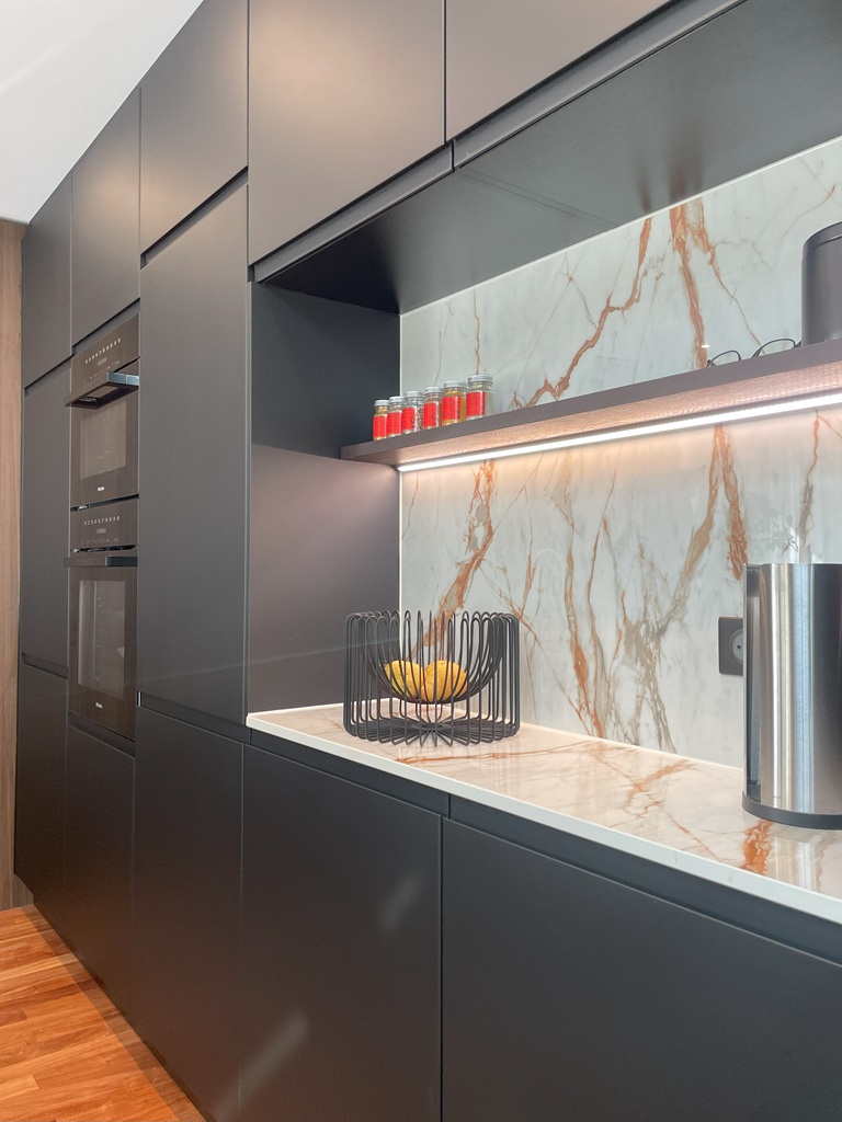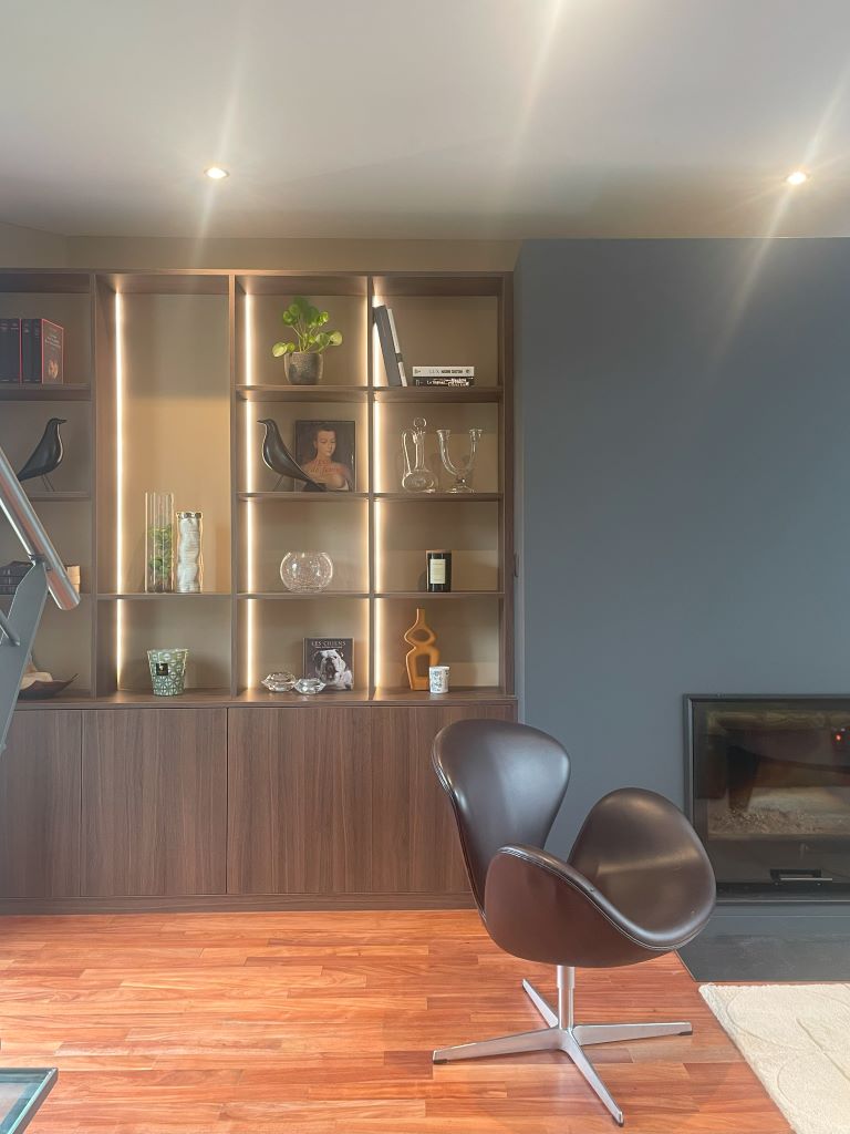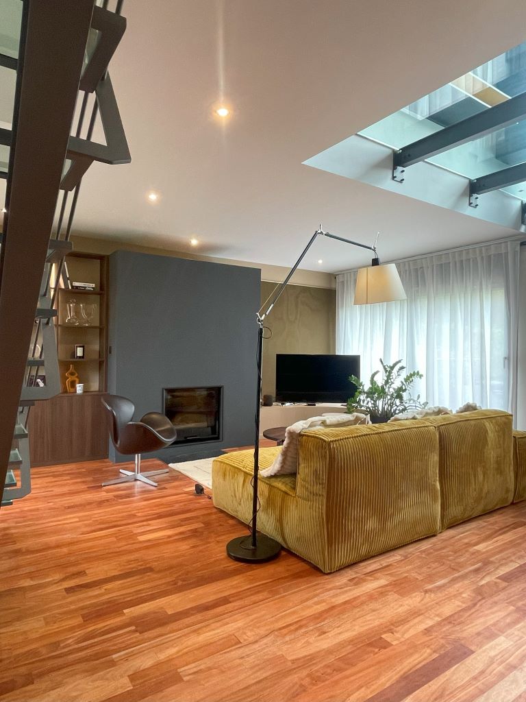 Dans cette belle maison contemporaine construite il y a plus de 10 ans avec un architecte, plusieurs choses ne convenaient plus à notre cliente. La décoration générale, mais surtout le manque d’aspect pratique de l’entrée, de la cheminée et de la cuisine. Le premier souci se situant dès l’entrée, puisque celle ci n’avait pas été démarquée, aucun espace de rangement, pas de meuble dépose clé, une vue directe sur l’espace de vie, mais aussi du froid qui pénétrait de suite à l’ouverture de la porte. Nous avons donc proposé de cloisonner l’espace, en ajoutant un mur en continuité du wc, ce qui a permis de mettre la porte d’accès au toilettes à distance de la vue, depuis l’espace de vie, ce qui était aussi un problème ! Cette cloison a permis d’un côté d’appuyer un petit bahut pour déposer les clés et autres accessoires mais aussi d’agrandir la cuisine de l’autre côté. Le mur a été peint dans le coloris « soupe d’ortie » de la magnifique gamme de peinture de Bilboquet déco. Le parquet d’origine a été conservé, nous l’avons simplement ravivé avec un ponçage léger et l’application d’une huile. Dans le fond de la pièce, on peut découvrir en « slidant », l’ancienne cheminée dont l’habillage prenait presque tout le mur. Nous avons réduit le volume d’encastrement du foyer et crée un meuble sur mesure en plâtre sur la droite, afin d’y poser la télévision. Puis sur la gauche, nous avons imaginé une magnifique bibliothèque permettant à la cliente de ranger des choses en partie basse et mettre en valeur de beaux objets et livres en partie haute. La bibliothèque réalisée par la menuiserie Lang a Habsheim, dans une finition chêne foncé, est rythmée par de nombreuses niches à différentes hauteurs, les verticales sont soulignées par des bandeaux led afin d’apporter un éclairage doux et diffut, mais aussi une sensation de flottement des appuis sur le mur. L’arrière est peint dans un coloris beige Albâtre qui contraste avec la cheminée relookée dans une tonalité plus sombre. Le coin salon est délimité par le canapé qui tourne le dos à la cuisine ouverte sur l’espace de vie. Le canapé modulable en velour côtelé trouvé chez Ligne Design à Lutterbach, fait face à la cheminée et à la télévision dont l’arrière plan est décoré du papier peint Moire de chez Elitis qui donne des reflets magiques et des tonalités changeantes selon le point de vue dans la pièce. Le fil conducteur de ces espaces sont les larges baies vitrées habillées de voilages réalisés sur mesure, du salon jusqu’à la cuisine. La cuisine n’a plus rien à voir avec ce qu’elle était, de par son style mais surtout par son implantation. Un vaste ilôt vient s’appuyer sur le mur du fond que nous avons habillé de panneaux de bois afin de fondre la porte technique menant au cellier. L’ilôt fait de façades noires mates est habillé d’une céramique marbre de chez X stone , il se poursuit par un plateau en bois assorti au mur et à la bibliothèque offrant un espace de repas pour quatres personnes. Pour un style minimaliste nous avons opté pour une plaque aspirante et un évier sous plan, le mitigeur très déco en finition laiton de chez Bradano apporte une touche chic et élégante à cette cuisine avec la suspension de Moooi au dessus du snack. Une large niche en marbre dans le linéaire de colonnes noires mates permet de poser les appareils électroménager. Le salon est rythmé par ce canapé design en velour de Franco Ferri, mais aussi le célèbre fauteuil Swan en cuir de Jacobsen. Un grand lampadaire sur pied Artemide vient éclairer cet espace de détente. Pour finir, le toilette s’est refait une beauté afin de s’assortir à l’ensemble, nous avons non seulement gagné de l’espace en abattant la cloison de gauche pour la pousser un peu vers la cuisine, mais nous avons relooké complètement le lieu. Un meuble sur mesure en bois foncé file sur le long du mur de gauche permettant d’y mettre une vasque à poser, quelques serviettes et bougies. Puis le bâti support a été rallongé et habillé du magnifique carrelage Aquarelle Olive de chez Wow design. Pour finir nous avons peint l’ensemble des murs dans le même coloris que l’entrée qui match parfaitement avec le carreau. Alors maintenant, on s’occupe de chez vous ?