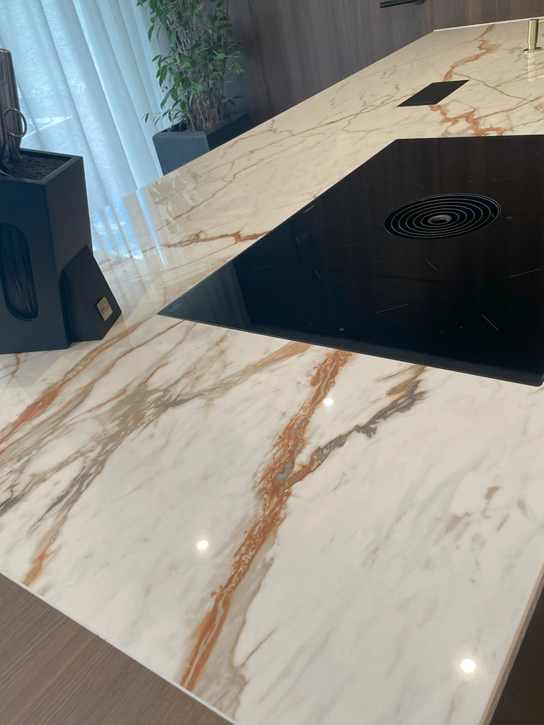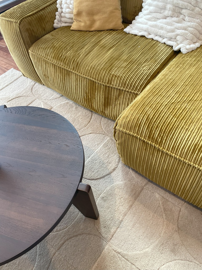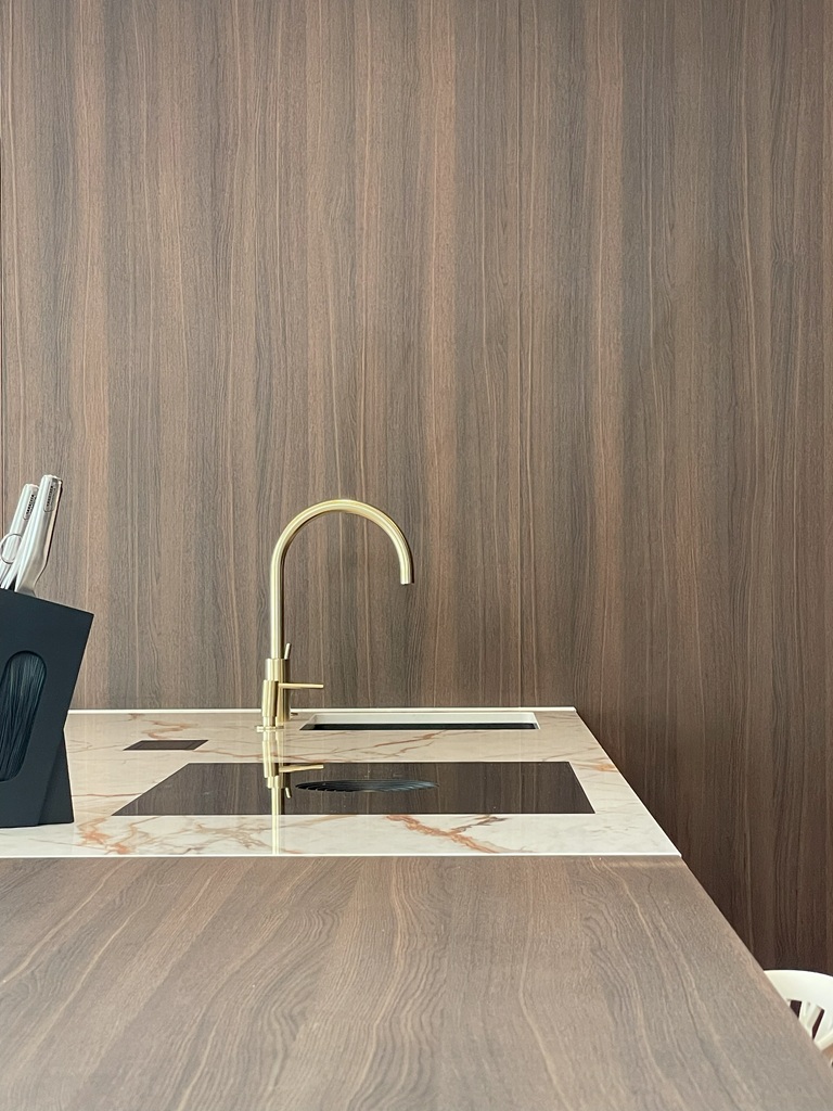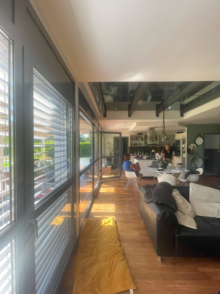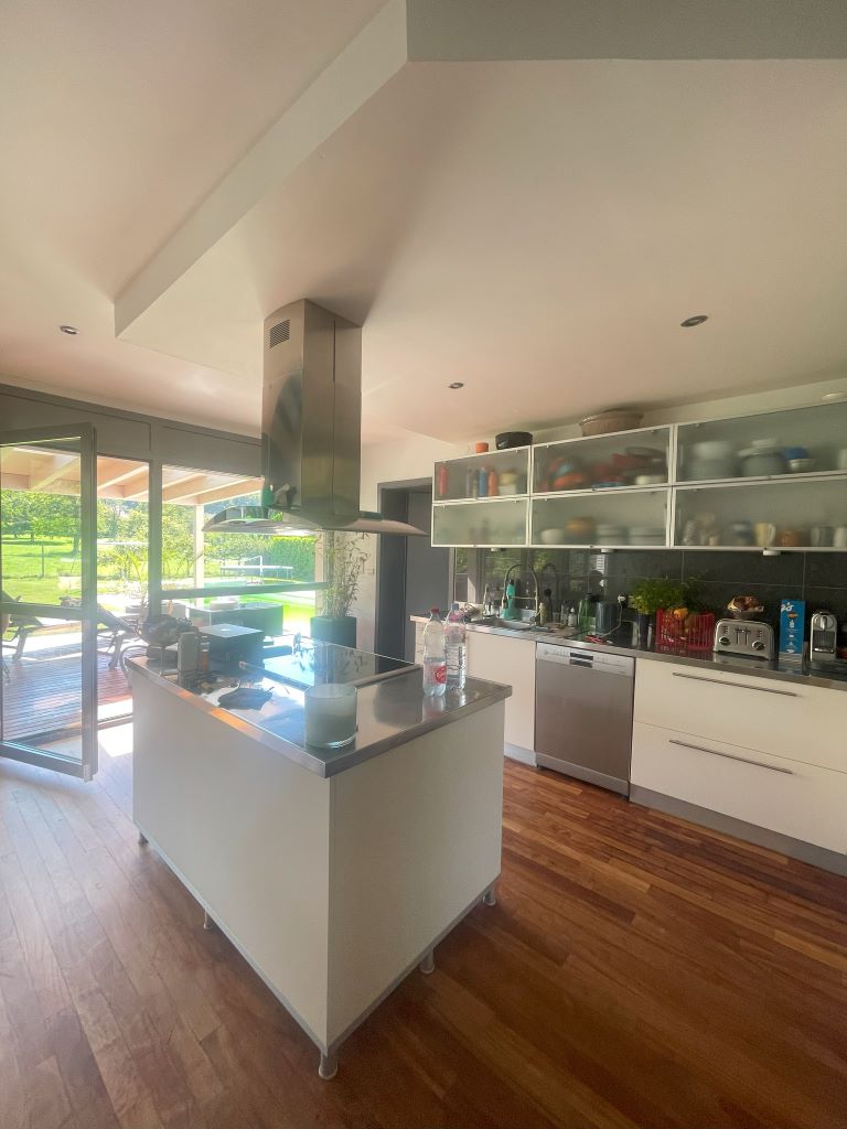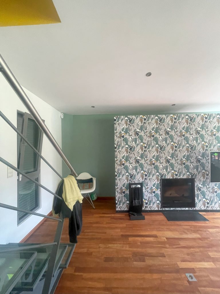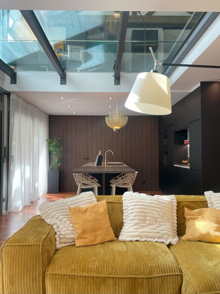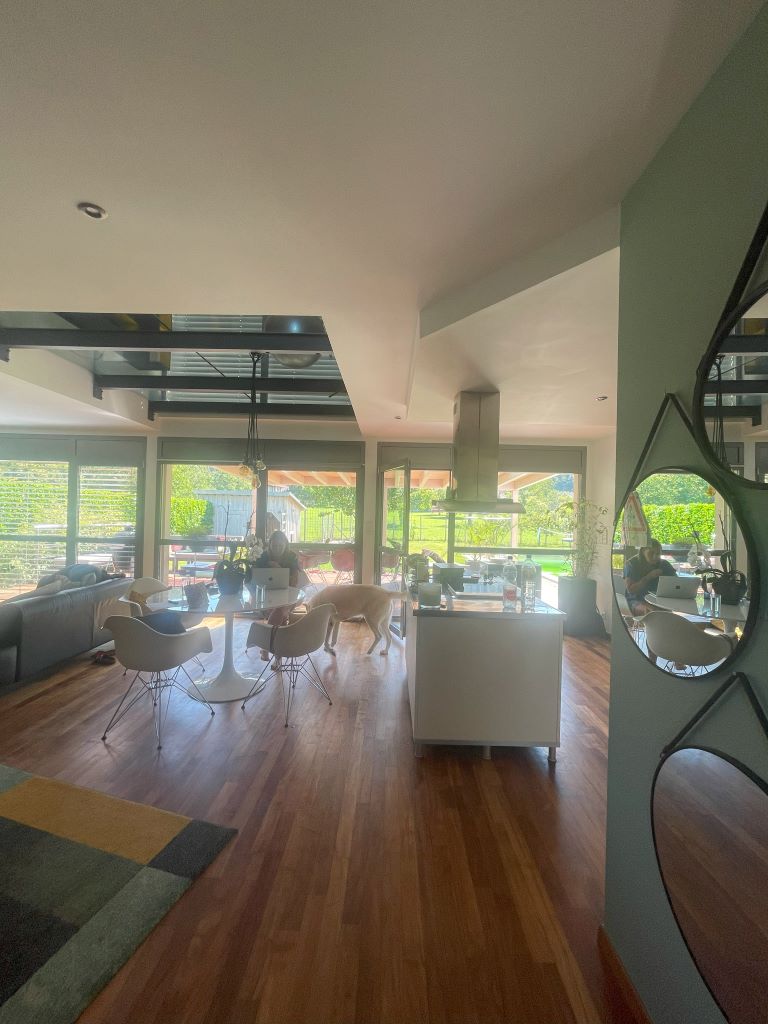 Dans cette belle maison contemporaine construite il y a plus de 10 ans avec un architecte, plusieurs choses ne convenaient plus à notre cliente. La décoration générale, mais surtout le manque d’aspect pratique de l’entrée, de la cheminée et de la cuisine. Le premier souci se situant dès l’entrée, puisque celle ci n’avait pas été démarquée, aucun espace de rangement, pas de meuble dépose clé, une vue directe sur l’espace de vie, mais aussi du froid qui pénétrait de suite à l’ouverture de la porte. Nous avons donc proposé de cloisonner l’espace, en ajoutant un mur en continuité du wc, ce qui a permis de mettre la porte d’accès au toilettes à distance de la vue, depuis l’espace de vie, ce qui était aussi un problème ! Cette cloison a permis d’un côté d’appuyer un petit bahut pour déposer les clés et autres accessoires mais aussi d’agrandir la cuisine de l’autre côté. Le mur a été peint dans le coloris « soupe d’ortie » de la magnifique gamme de peinture de Bilboquet déco. Le parquet d’origine a été conservé, nous l’avons simplement ravivé avec un ponçage léger et l’application d’une huile. Dans le fond de la pièce, on peut découvrir en « slidant », l’ancienne cheminée dont l’habillage prenait presque tout le mur. Nous avons réduit le volume d’encastrement du foyer et crée un meuble sur mesure en plâtre sur la droite, afin d’y poser la télévision. Puis sur la gauche, nous avons imaginé une magnifique bibliothèque permettant à la cliente de ranger des choses en partie basse et mettre en valeur de beaux objets et livres en partie haute. La bibliothèque réalisée par la menuiserie Lang a Habsheim, dans une finition chêne foncé, est rythmée par de nombreuses niches à différentes hauteurs, les verticales sont soulignées par des bandeaux led afin d’apporter un éclairage doux et diffut, mais aussi une sensation de flottement des appuis sur le mur. L’arrière est peint dans un coloris beige Albâtre qui contraste avec la cheminée relookée dans une tonalité plus sombre. Le coin salon est délimité par le canapé qui tourne le dos à la cuisine ouverte sur l’espace de vie. Le canapé modulable en velour côtelé trouvé chez Ligne Design à Lutterbach, fait face à la cheminée et à la télévision dont l’arrière plan est décoré du papier peint Moire de chez Elitis qui donne des reflets magiques et des tonalités changeantes selon le point de vue dans la pièce. Le fil conducteur de ces espaces sont les larges baies vitrées habillées de voilages réalisés sur mesure, du salon jusqu’à la cuisine. La cuisine n’a plus rien à voir avec ce qu’elle était, de par son style mais surtout par son implantation. Un vaste ilôt vient s’appuyer sur le mur du fond que nous avons habillé de panneaux de bois afin de fondre la porte technique menant au cellier. L’ilôt fait de façades noires mates est habillé d’une céramique marbre de chez X stone , il se poursuit par un plateau en bois assorti au mur et à la bibliothèque offrant un espace de repas pour quatres personnes. Pour un style minimaliste nous avons opté pour une plaque aspirante et un évier sous plan, le mitigeur très déco en finition laiton de chez Bradano apporte une touche chic et élégante à cette cuisine avec la suspension de Moooi au dessus du snack. Une large niche en marbre dans le linéaire de colonnes noires mates permet de poser les appareils électroménager. Le salon est rythmé par ce canapé design en velour de Franco Ferri, mais aussi le célèbre fauteuil Swan en cuir de Jacobsen. Un grand lampadaire sur pied Artemide vient éclairer cet espace de détente. Pour finir, le toilette s’est refait une beauté afin de s’assortir à l’ensemble, nous avons non seulement gagné de l’espace en abattant la cloison de gauche pour la pousser un peu vers la cuisine, mais nous avons relooké complètement le lieu. Un meuble sur mesure en bois foncé file sur le long du mur de gauche permettant d’y mettre une vasque à poser, quelques serviettes et bougies. Puis le bâti support a été rallongé et habillé du magnifique carrelage Aquarelle Olive de chez Wow design. Pour finir nous avons peint l’ensemble des murs dans le même coloris que l’entrée qui match parfaitement avec le carreau. Alors maintenant, on s’occupe de chez vous ?