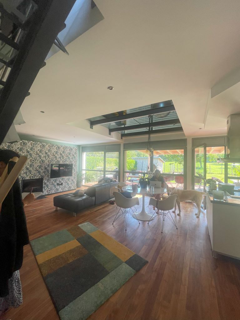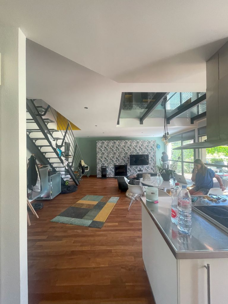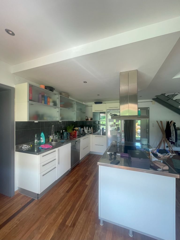 Décoration d’un séjour avec cuisine ouverte d’une maison d’architecte à Koestlach.