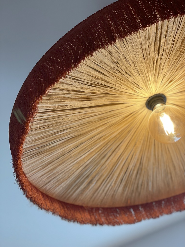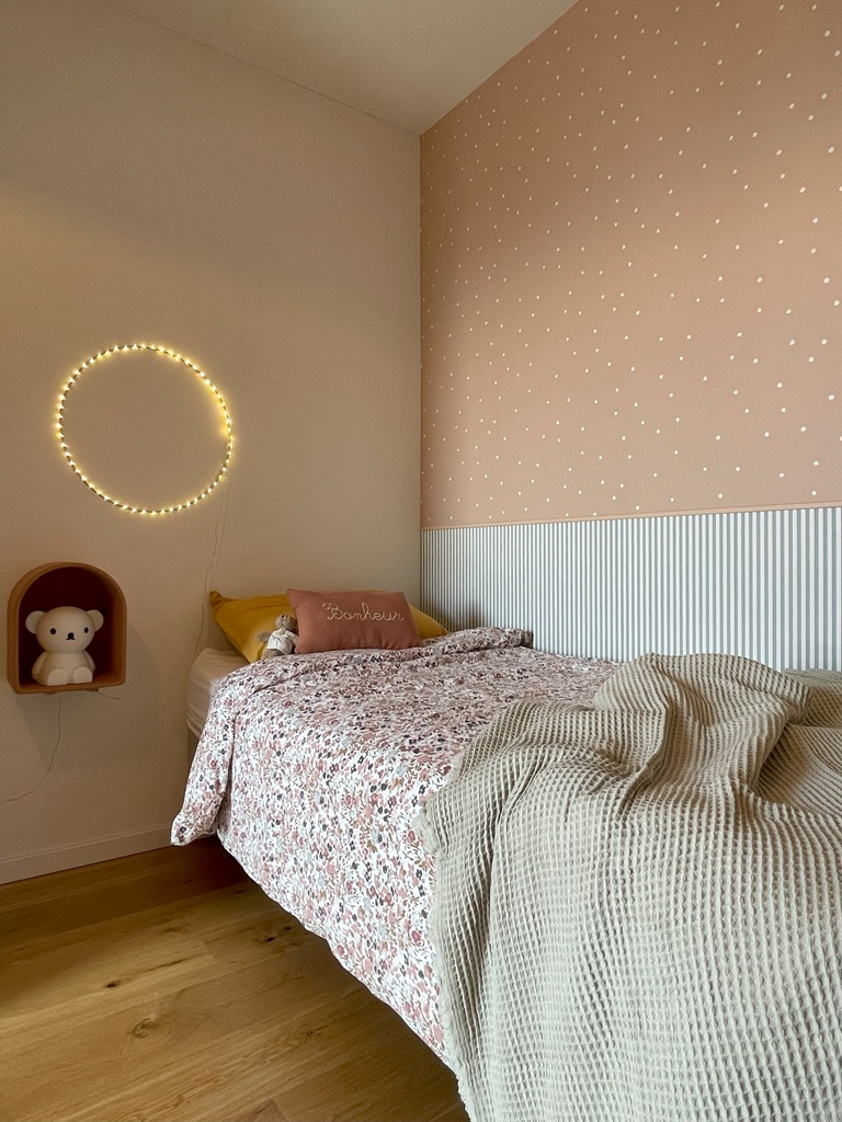 L’éclairage, soigneusement pensé, vient parfaire l’ensemble. Au plafond, le grand plafonnier en raphia à franges de Kave Home diffuse une lumière chaleureuse et naturelle, tandis qu’un cercle lumineux mural, placé près du lit, crée une ambiance douce et rassurante.