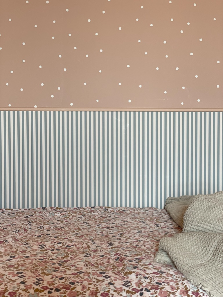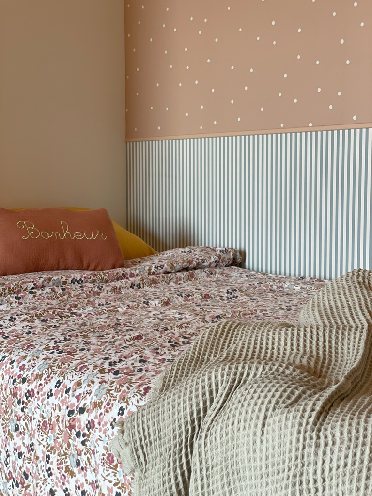 Côté lit enfant, la décoration joue avec les matières et les motifs. La couette à fleurs Liberty Terre de Nuit apporte une note romantique et délicate, contrastée par la texture enveloppante d’un plaid gaufré signé Nordal. Les murs racontent eux aussi une histoire : un soubassement en papier peint à rayures bleues structure l’espace, tandis que le papier peint à pois couleur coral de chez Sandberg illumine la pièce avec subtilité et modernité.