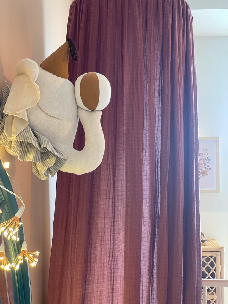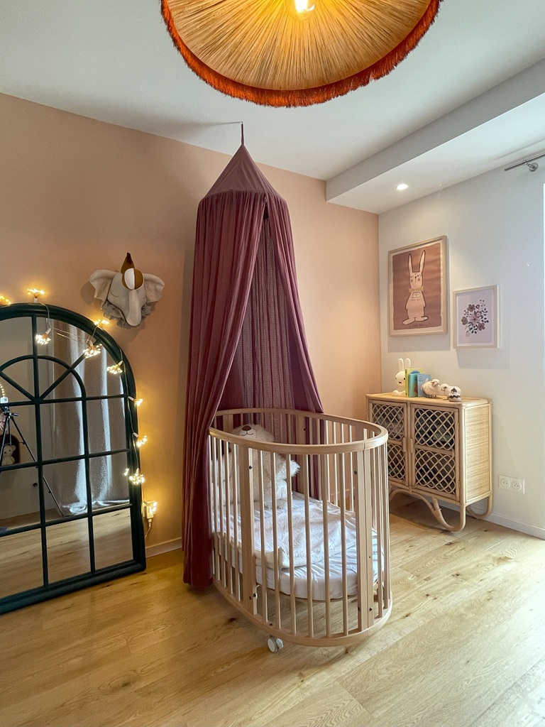Au centre de la pièce, le berceau devient un véritable cocon. Sublimé par un ciel de lit bordeaux sélectionné chez Smallable, il invite au repos et aux nuits délicates. Juste au-dessus, une peluche trophée murale du site Le Petit Florilège veille tendrement, apportant une touche poétique et ludique à l’ensemble. Des paniers décoratifs, également signés Le Petit Florilège, viennent accessoiriser l’espace avec chaleur et authenticité.