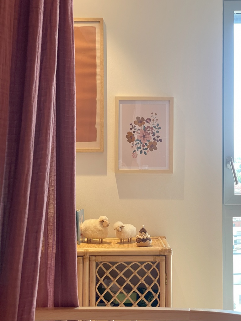Le regard se pose ensuite sur le petit meuble en rotin, aux lignes naturelles et intemporelles. Surmonté d’affiches illustrées de La Redoute Intérieurs et Juniqe, il compose un coin décoratif à la fois doux et graphique, parfait pour stimuler l’imaginaire tout en conservant une harmonie apaisante.