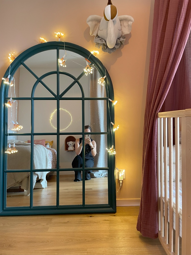 À gauche, un grand miroir ancien, chiné et réinterprété, a été repeint en vert foncé pour lui offrir une seconde vie. Habillé d’une guirlande lumineuse, il reflète une lumière douce et rassurante, comme un écho aux rêveries d’enfance.