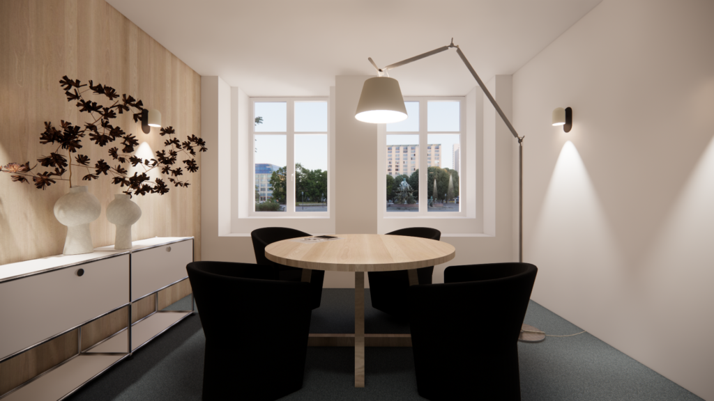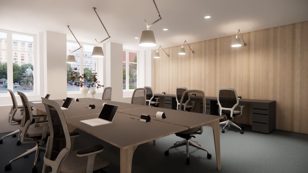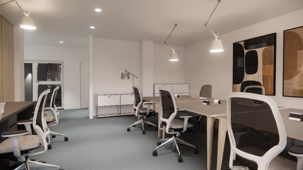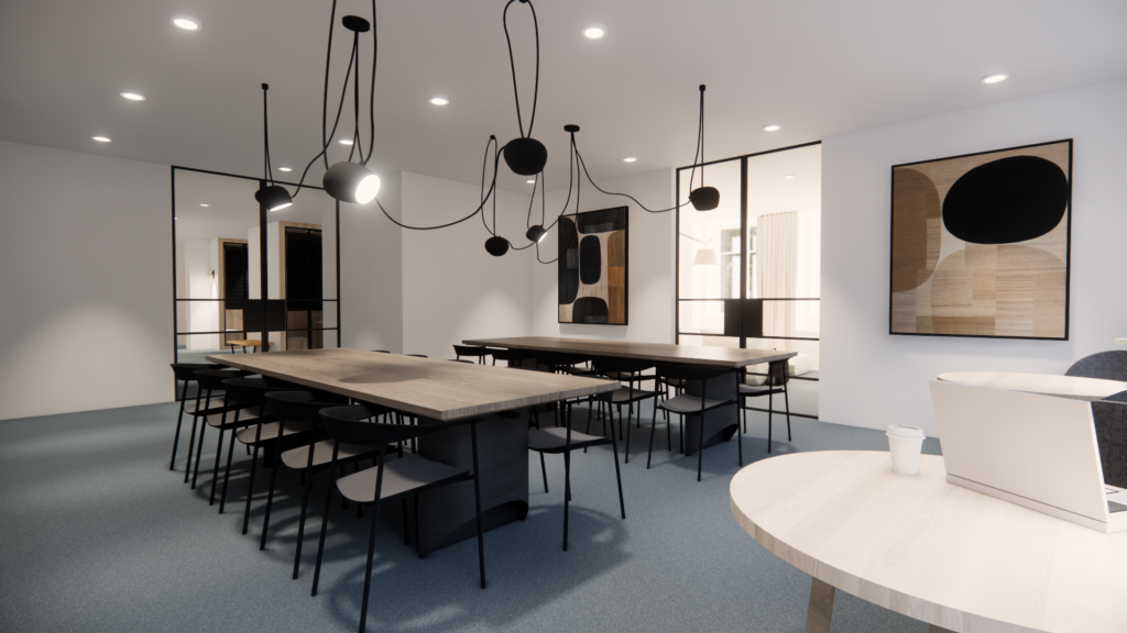 Ce projet met en avant un design minimaliste et raffiné, où la fonctionnalité se conjugue avec l’esthétique. L’utilisation de matériaux nobles, de mobilier de référence tel que les célèbres meubles USM ou encore les luminaires Artemide, et une palette sobre crée une atmosphère professionnelle, accueillante et durable.