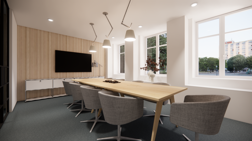 Un grand espace de réunion, lumineux et convivial, favorisant le travail collaboratif et les présentations d’équipes.